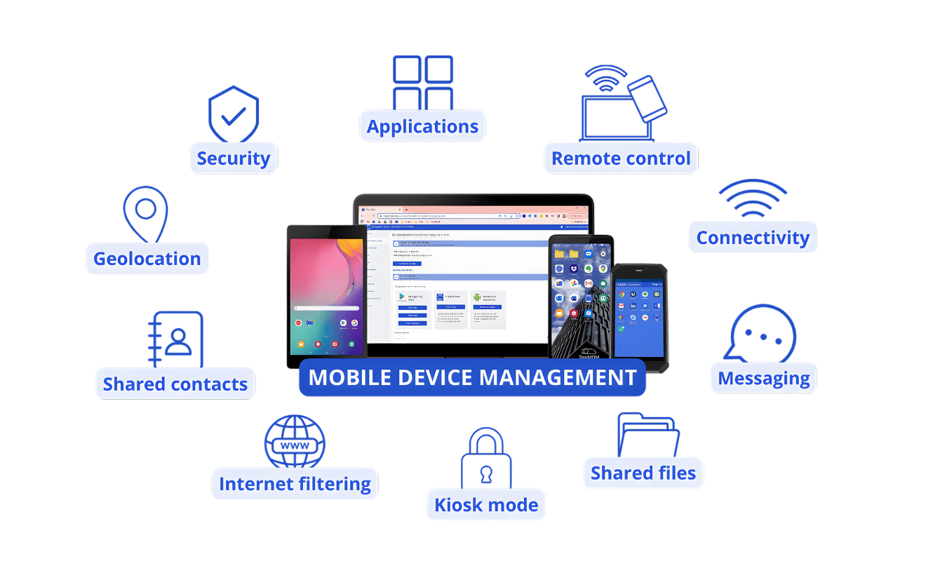 The enterprise MDM solutions experts deploy — including 42Gears SureMDM — deliver a comprehensive capability set across device management, application control, and security enforcement. The full feature set available through MDM deployments includes: