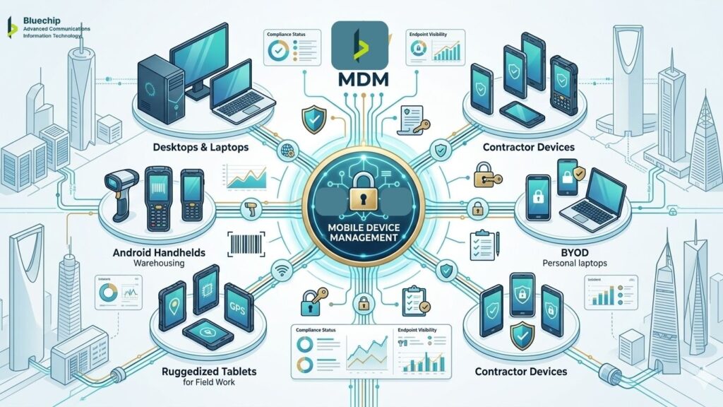 A decade ago, most Saudi organizations managed a predictable estate of office-based desktops and company-issued laptops. Today, that picture looks very different. Employees work from home, from client sites, from hotel Wi-Fi, and from personal devices they bought themselves. Warehouses run on Android handhelds. Field engineers carry ruggedized tablets. Contractors bring their own smartphones into secure facilities. Each of these endpoints is a potential point of failure — and without centralized management, your IT team has no reliable way to enforce security, respond to incidents, or maintain compliance.